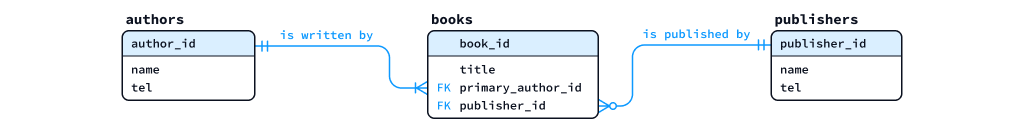 - 外部キーのカラム名は、参照先テーブルの主キー名と 必ずしも同一である必要はありません。たとえば、この例では、authors テーブルでは主キーを author_id とし、books テーブルではそれを指す外部キーとして primary_author_id を用いています。