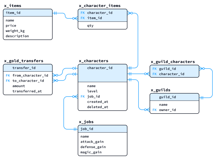 x_guilds.owner_idはx_characters.character_idをON DELETE CASCADEで参照しているため (キャラの削除が成立した場合は) そのキャラが所有するギルドは自動的に削除される。ただしx_gold_transfersがキャラを参照しておりON DELETEが未指定であるため、送受信履歴が残っているキャラはFK違反により削除できない。